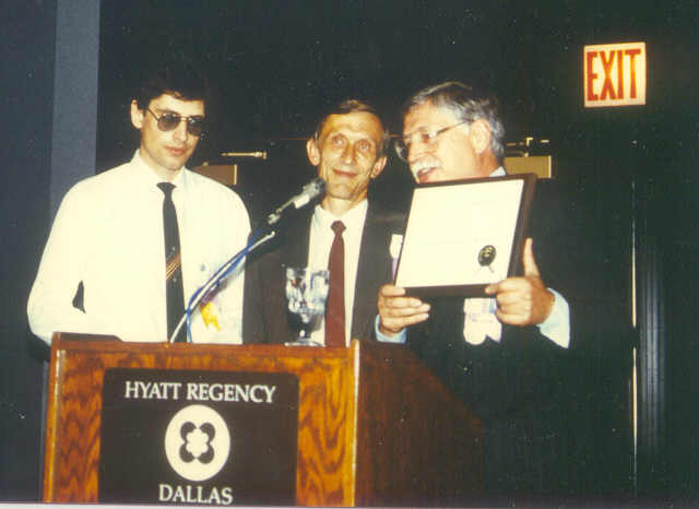 Рис. 1. Председатель Клуба Пионеров компьютерной графики вручает Ю.М.Баяковскому сертификат о принятии его в Клуб (1990 г., Даллас)