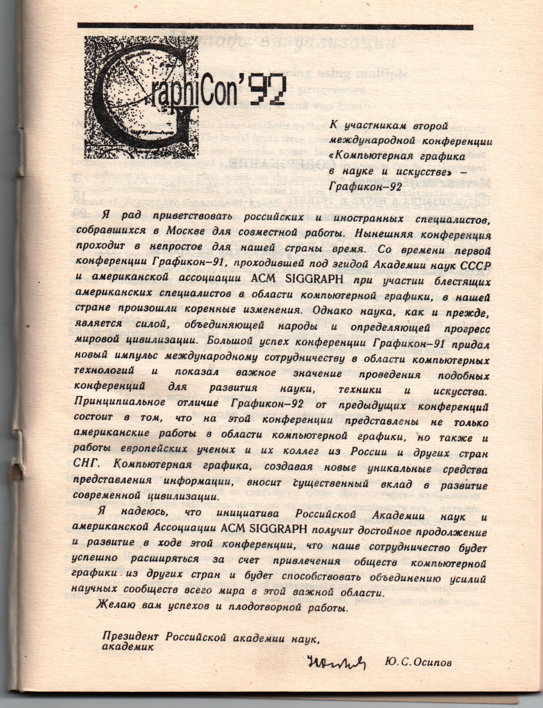 Рис.12. Приветствие Президента РАН Ю.С.Осипова участникам конференции Графикон-92. Больше мы таких высоких приветствий не получали, может за исключением 1995 г. (см. ниже). Но, правда, и не пытались их организовать.