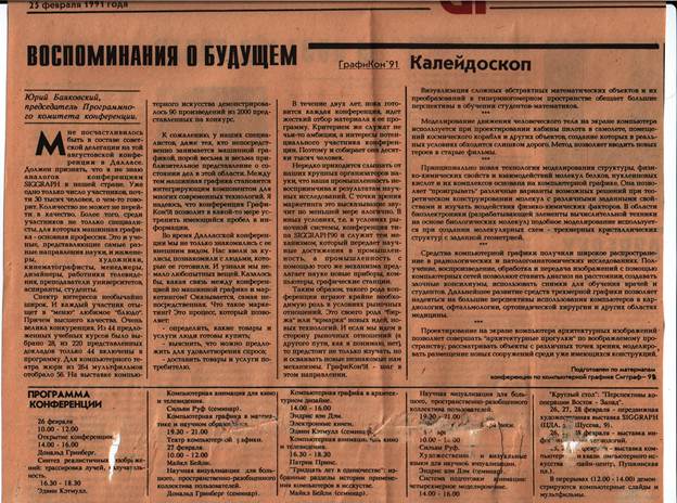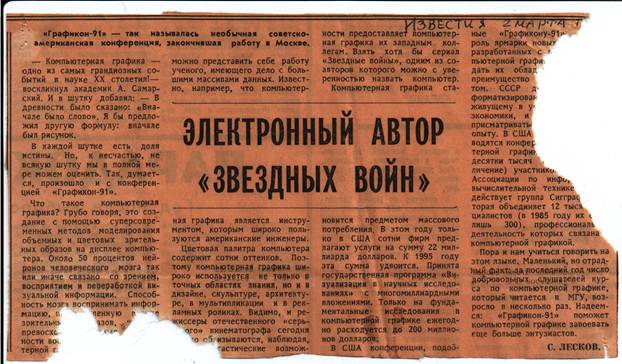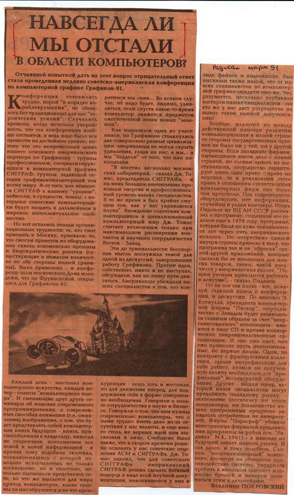 Рис. 8. А это публикация в газете «Радикал» уже по итогам Графикона-91. Корреспонденты наших ведущих изданий, по словам А.Волобоя, присутствовавшего на одной из пресс-конференций, были просто ошарашены ответом С.П.Курдюмова на вопрос об уровне советской науки и техники в области компьютерной графики. Общепринятым тогда было мнение, что у нас сильны точные науки, физика и математика, а тут вдруг ответ – что ниже уже некуда – техники нет вообще. Воцарилось молчание…